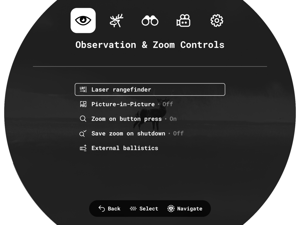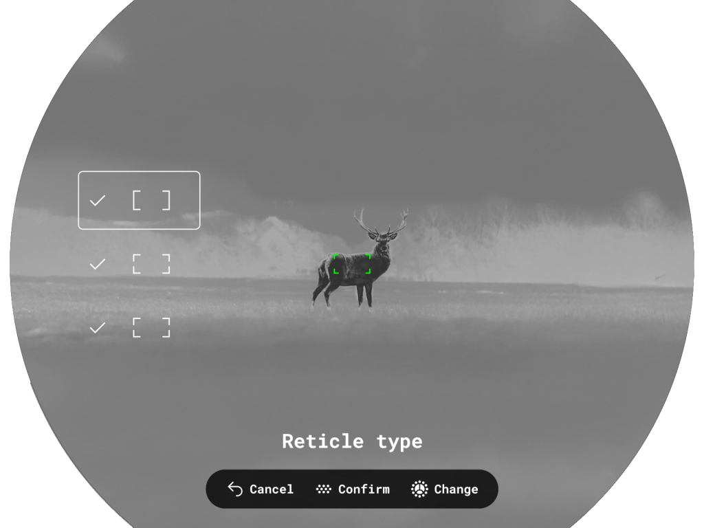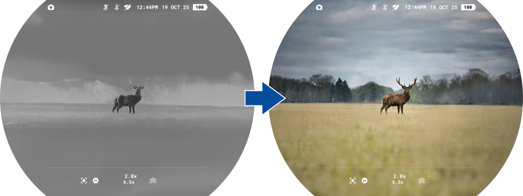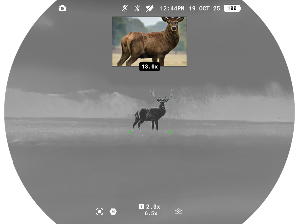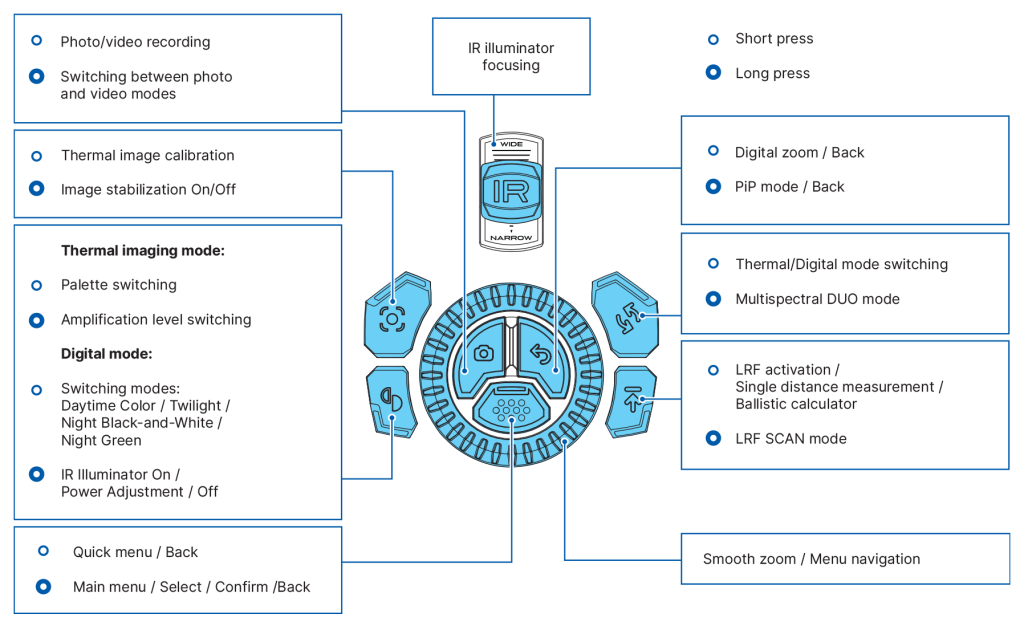 Symbion LRF binoculars allow you to quickly switch between thermal imaging and digital channels. The digital channel can be used in both color and black-and-white modes. There is support for the Duo multispectral mode, where the image from one channel is displayed in the main window and the image from the second channel is displayed in a PiP (Picture in Picture) window.